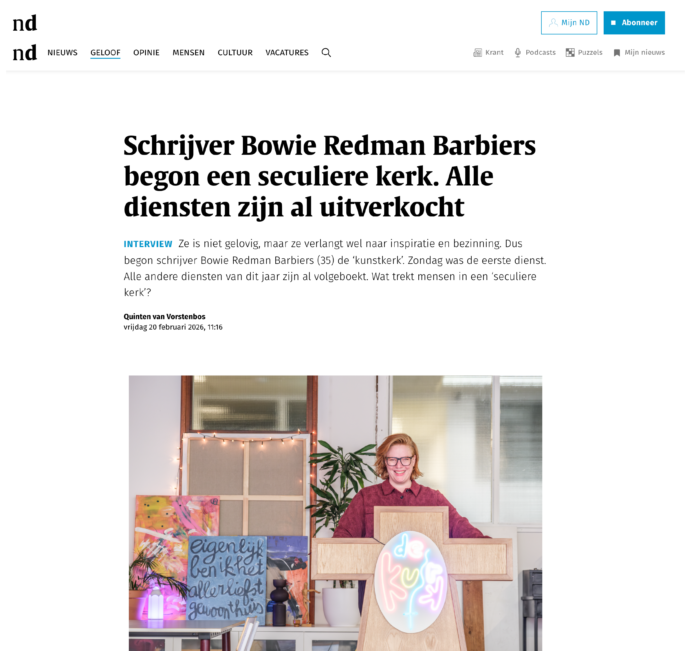 "Ik ben zelf niet gelovig opgevoed. Ik kom zelfs uit een hele lange lijn van ongelovigen. Maar ik heb me wel altijd aangetrokken gevoeld tot het ritueel van de kerk. Ik vind het een mooi concept: dat je wekelijks samenkomt, een vorm van gemeenschap hebt, bezinning, inspiratie, een fijn wekelijks ritueel dat je leven houvast geeft. Alleen past God voor mij persoonlijk niet zo goed, dus ik dacht: wat voor plek kan ik maken voor ongelovigen die wél het ritueel willen maar niet de religie?" -